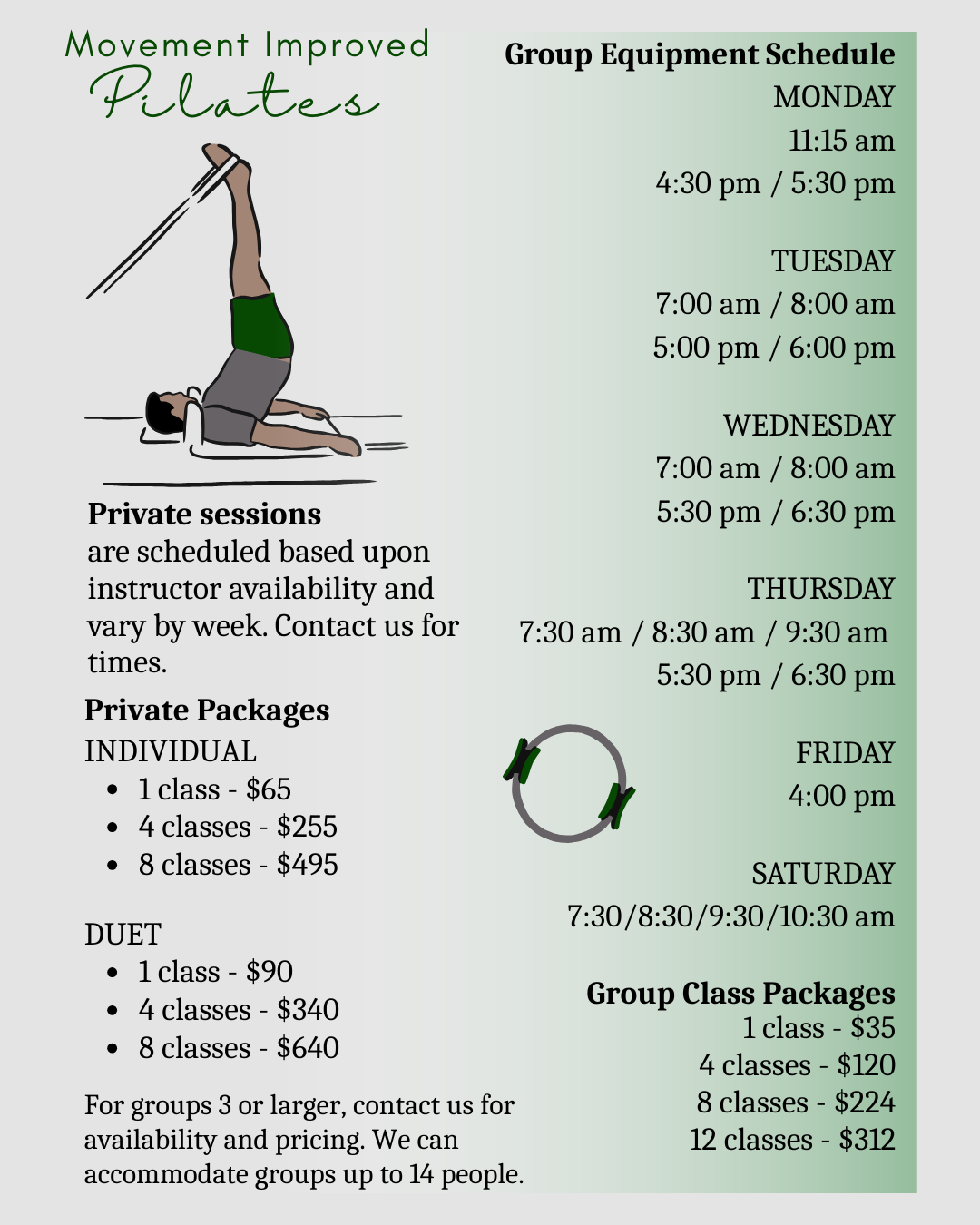 Our clients purchase individual classes, packages, or privates that work for them and their budget.
